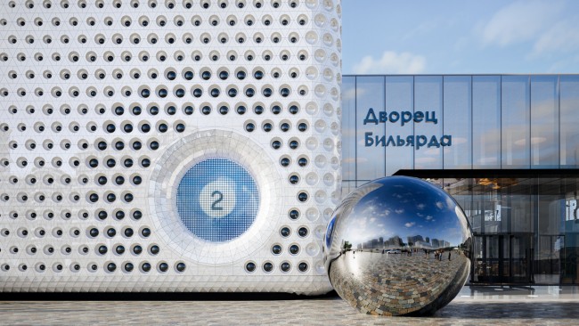 Фасады бильярдной арены будут отделаны белыми кассетами. Входные группы будут выделены остеклением, контрастирующим с закрытыми основными блоками здания.