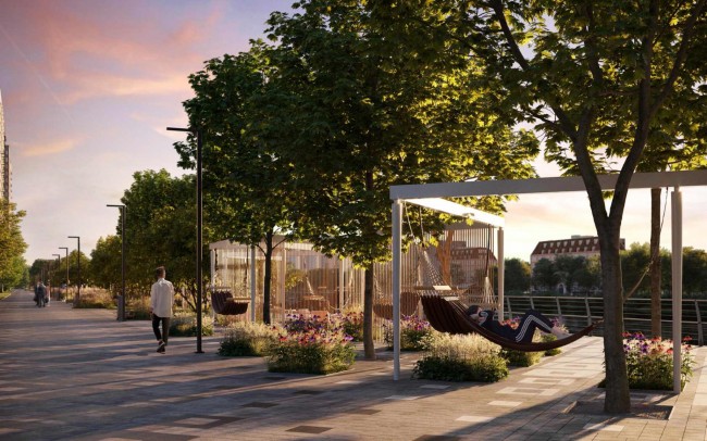 Пространство оснастят пешеходной зоной, а также вело‑ и беговыми дорожками. Для отдыха обустроят зоны с навесами и разноуровневыми лавочками, для детей предусмотрят игровую площадку. Кроме того, появится спортплощадка с современными тренажерами. Территорию озеленят: высадят крупные деревья, обустроят газоны, цветники и кустарники.